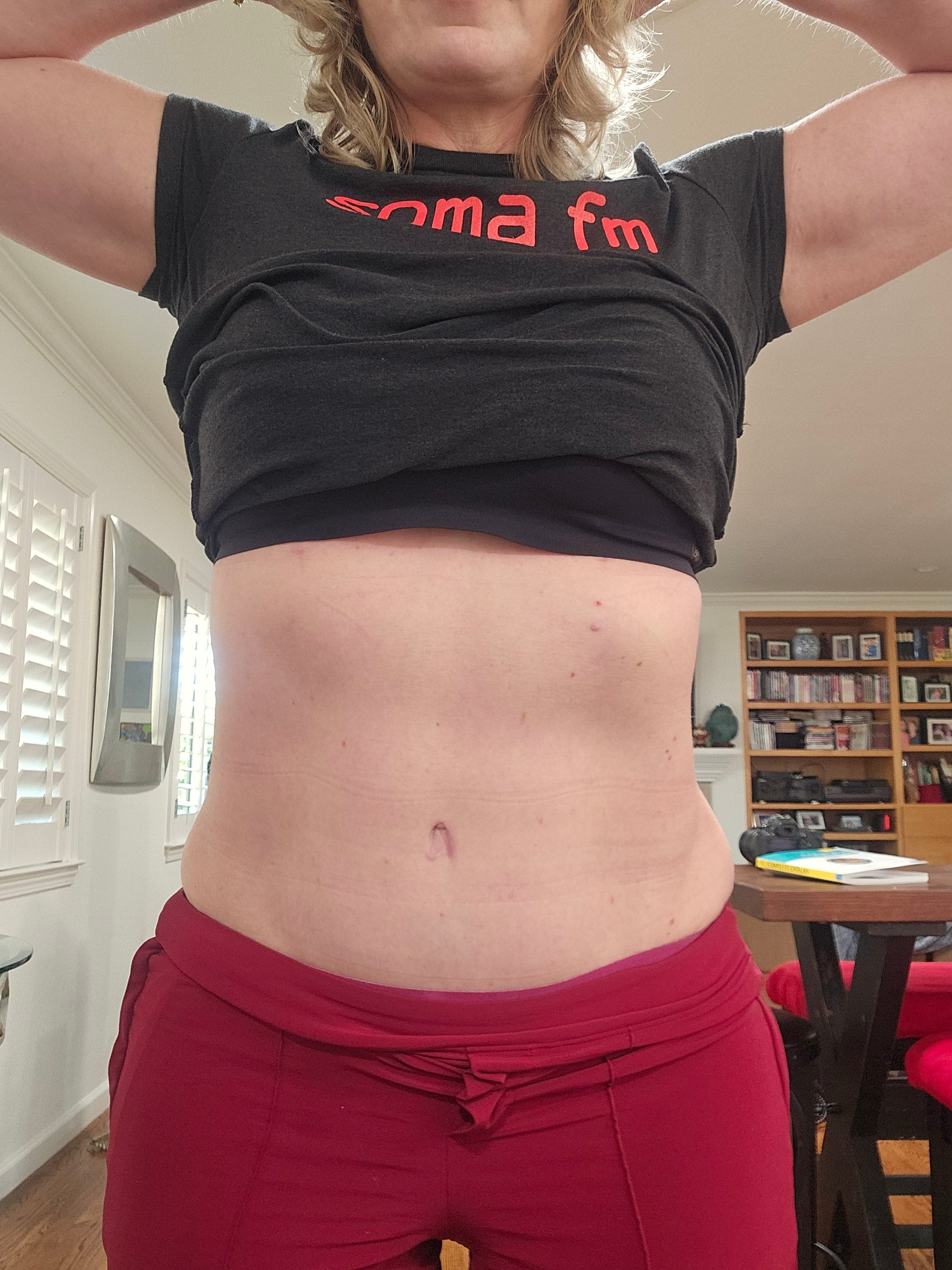 Let me just be clear…I think everyone should feel free to expose their body without shame, no matter what kind of body they have. I should have felt okay to show my belly before, when it was poochy and saggy, because poochy and saggy bellies are absolutely normal, especially for 54-year-old women who have had several kids. But, I felt ashamed and I always wanted to cover it up. There is absolutely no reason for me to feel ashamed now, and yet I still feel residual belly shame and weirdness and I DON’T LIKE IT.